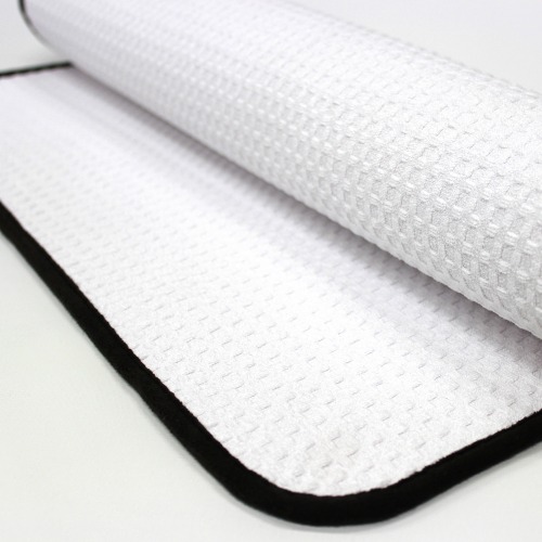 Square shaped waffle weave increases surface area of towel, which further increases absorption.